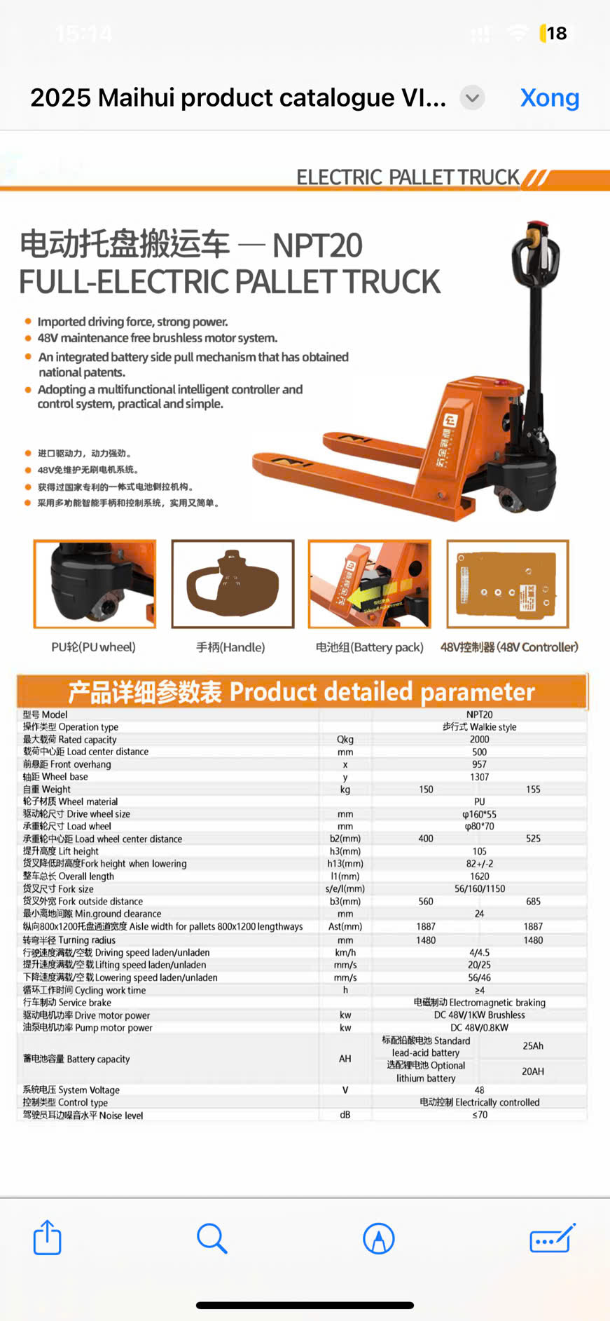 Xe nâng tay điện tự động 2 tấn NPT20 550mm